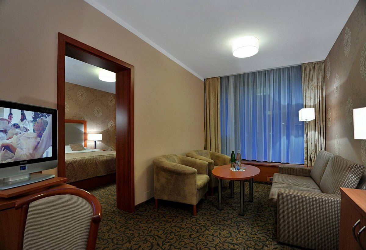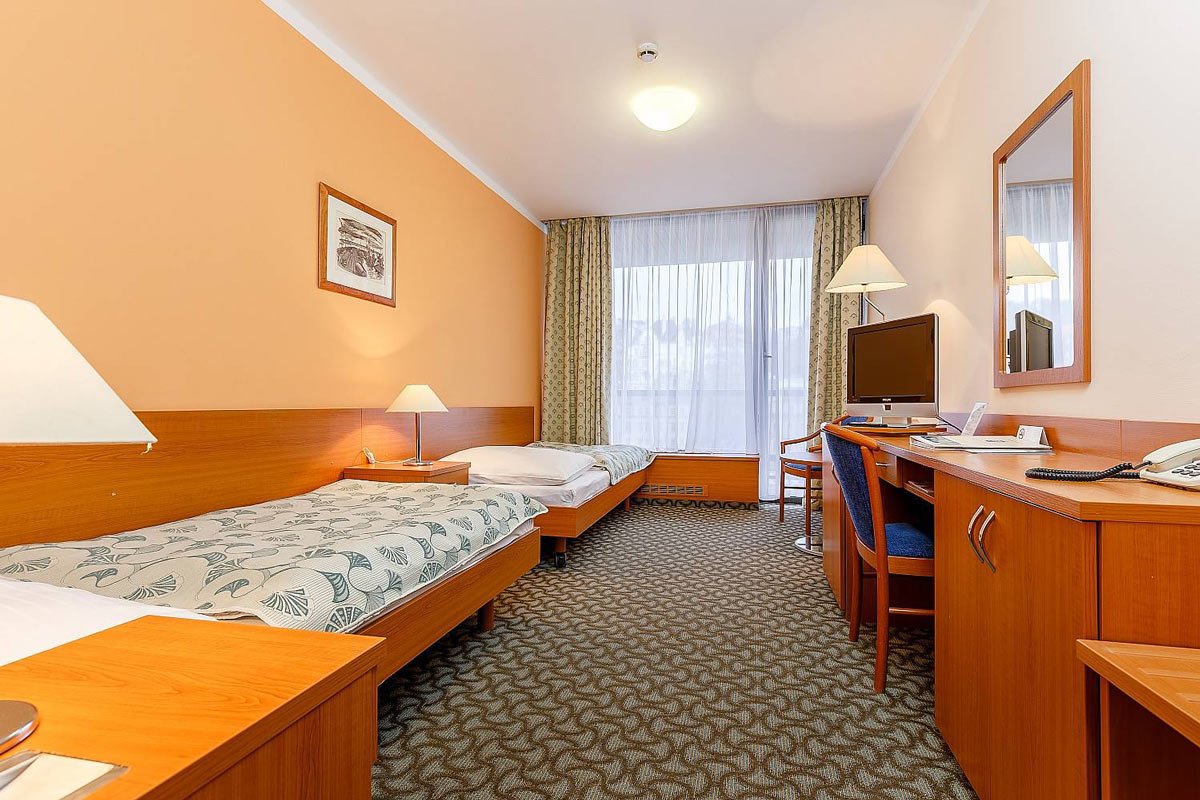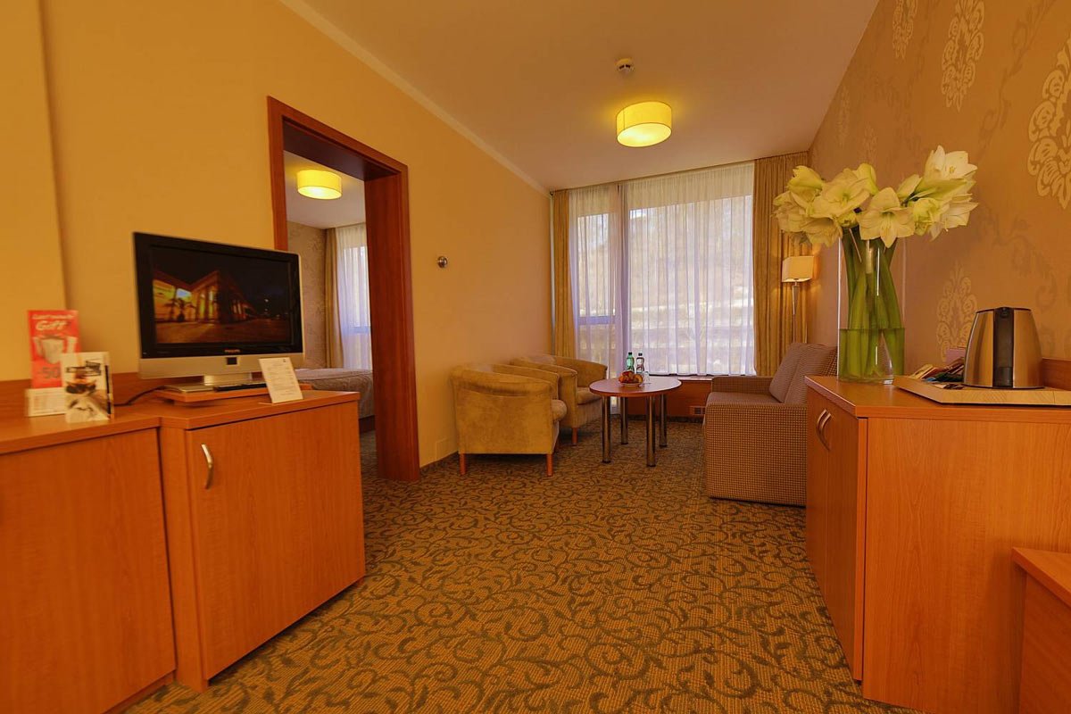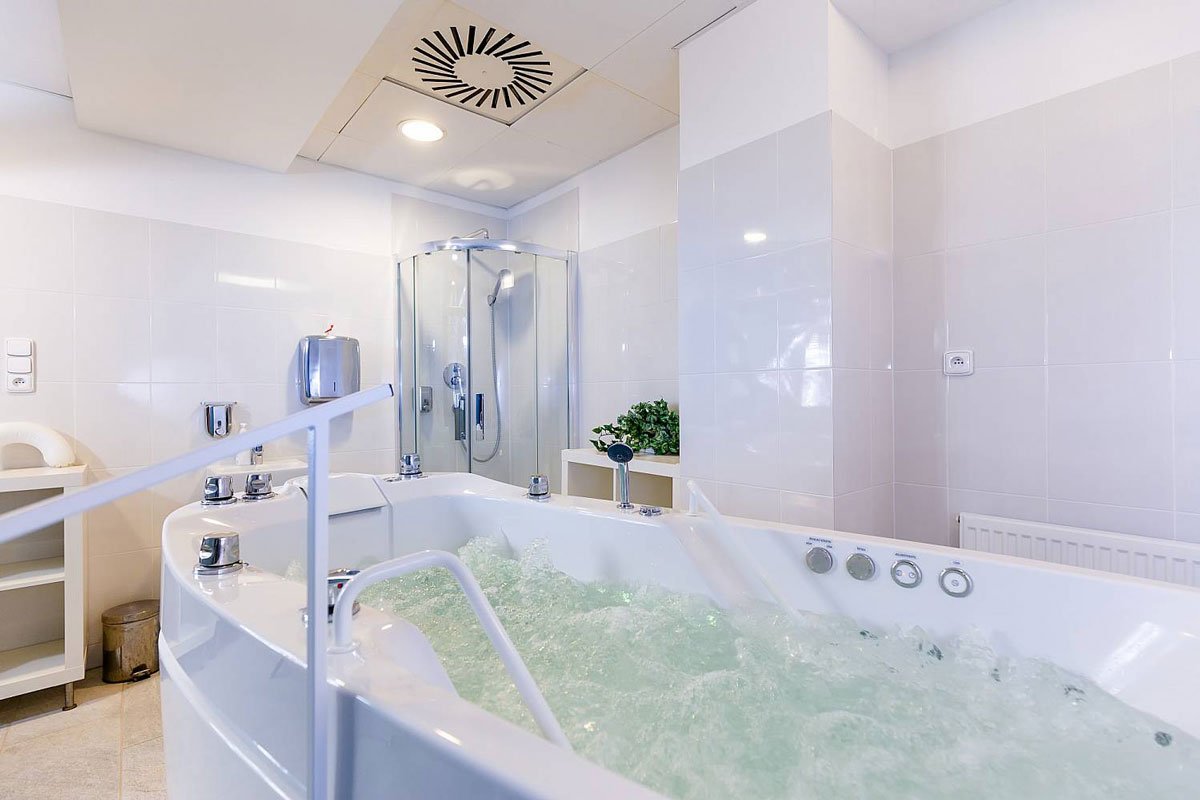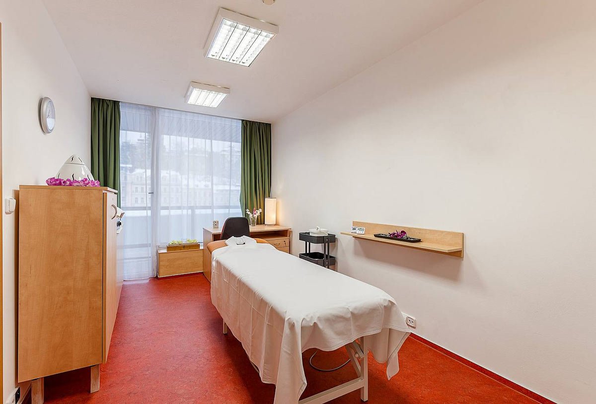 حيث يحتوي على مركز جديد وحديث وواسع يقدم خدمات كثيرة للعلاج والنقاهة. ويقدم المركز أكثر من 50 تمرين مختلف وخدمة للعلاج والنقاهة. بالإضافة الى المياه المعدنية المشهورة في مدينة كارلوفي فاري وهي مياه ساخنة تحتوي على الكربون والكبريت وكلوريد الصوديوم ونسبة الأملاح فيها متوسطة. وتتميز هذه المياه بتاثيرها على إفراز العصارة الهضمية والبنكرياس والتأثير على نشاط المواد الهضمية في الاثنا عشر وتقليل نسبة السكر في الدم والبول وتحسين التوازن الحمضي في الجسم وتقليل نسبة حمض اليوريك في الدم وتقليل نسبة الكولسترول ودهون أخرى في الدم.